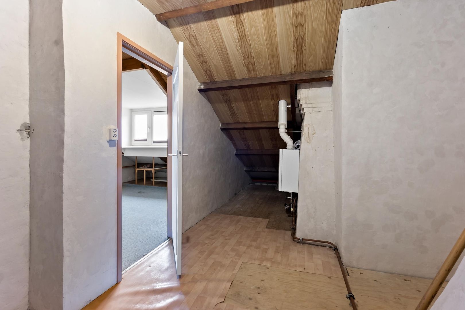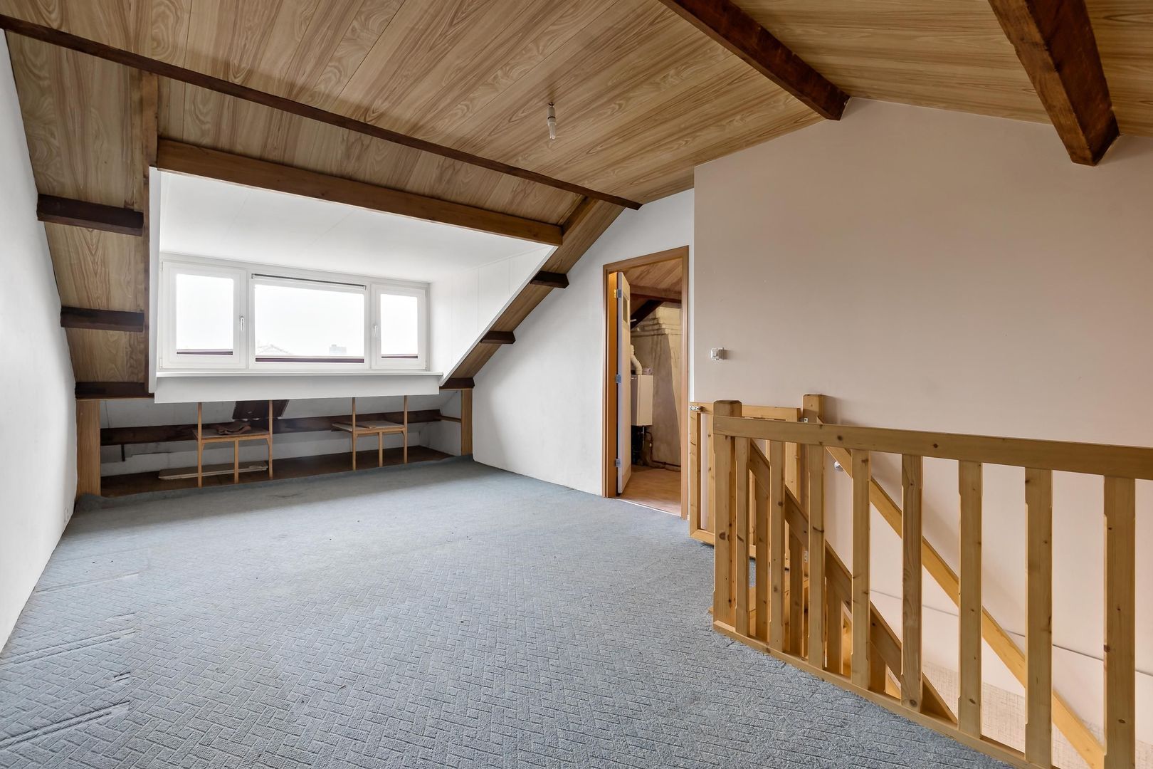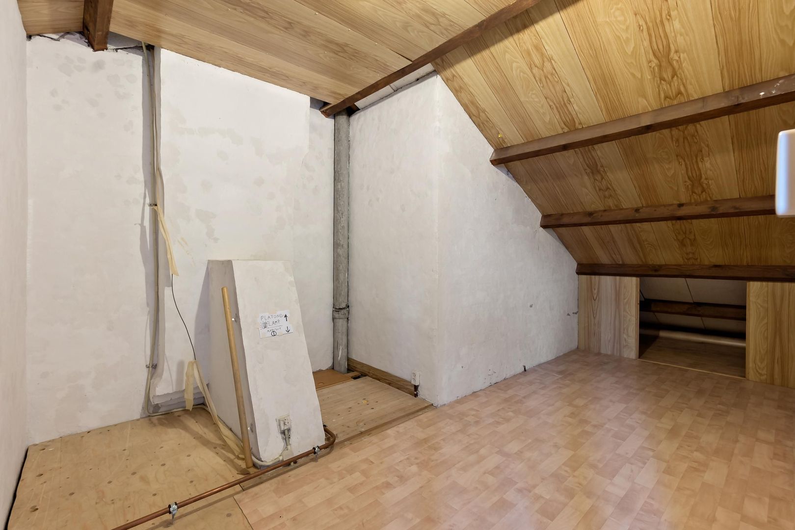 De indeling omvat een centrale entree, een ruime hal, een woonkamer met vaste kasten en toegang tot een balkon, een keuken met doucheruimte, en een slaapkamer met balkon. Boven is er een zolderkamer met dakkapel en extra bergruimte. Met een woonoppervlakte van circa 93 m² en 4 kamers biedt het appartement veel potentieel.
