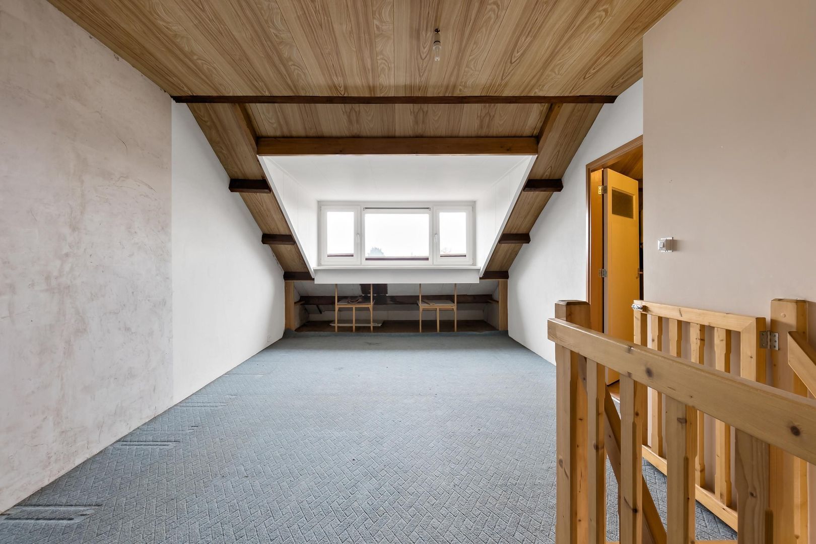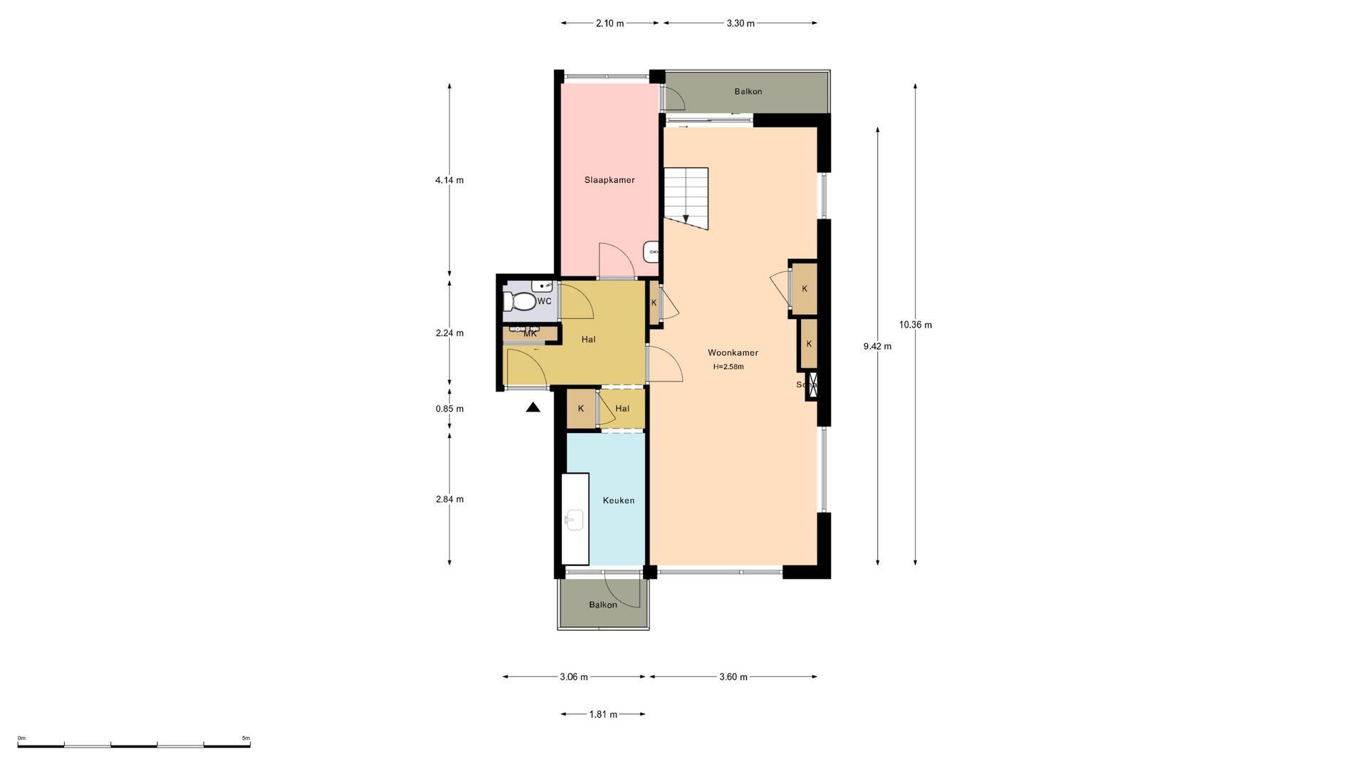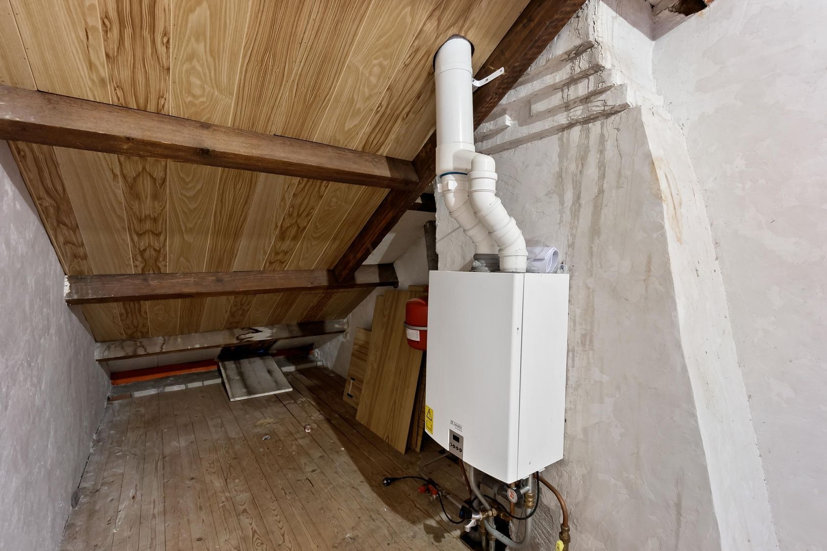 De indeling omvat een centrale entree, een ruime hal, een woonkamer met vaste kasten en toegang tot een balkon, een keuken met doucheruimte, en een slaapkamer met balkon. Boven is er een zolderkamer met dakkapel en extra bergruimte. Met een woonoppervlakte van circa 93 m² en 4 kamers biedt het appartement veel potentieel.
