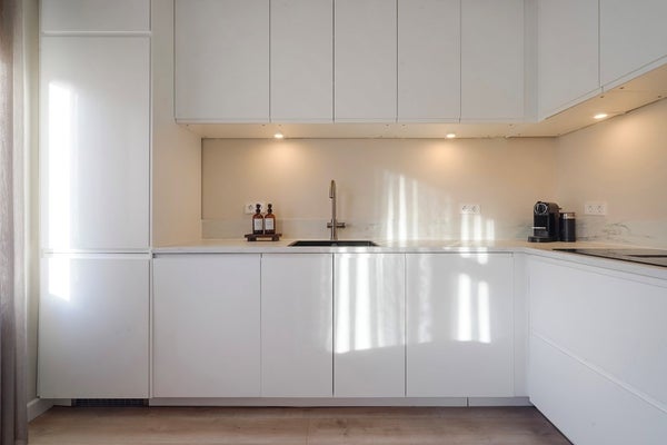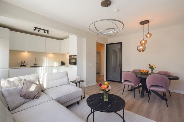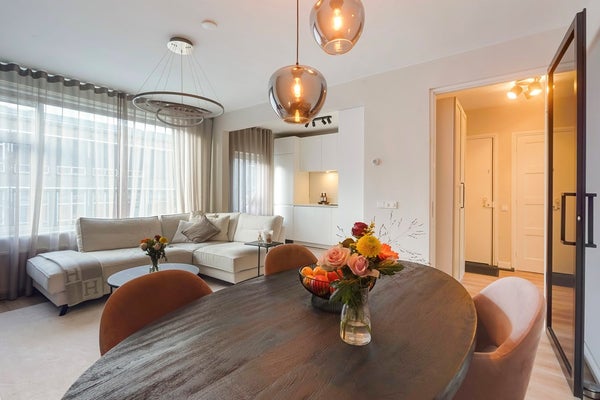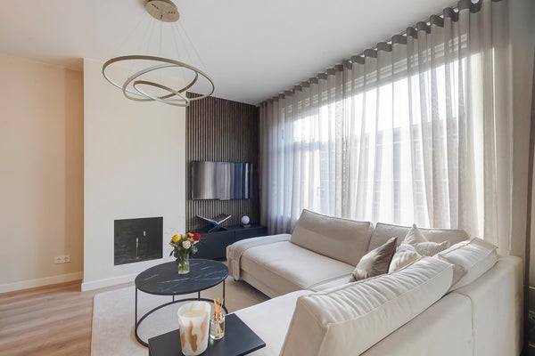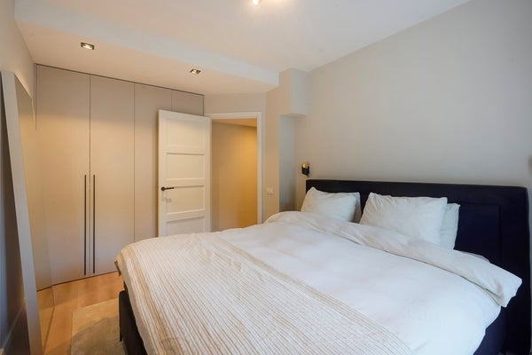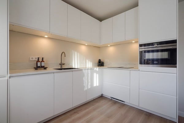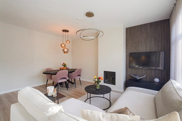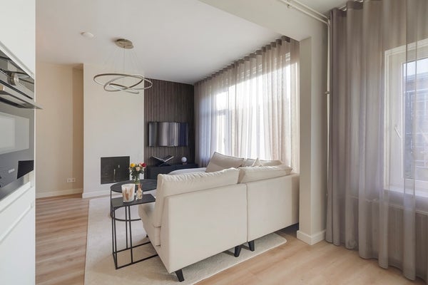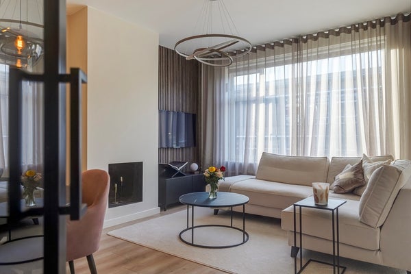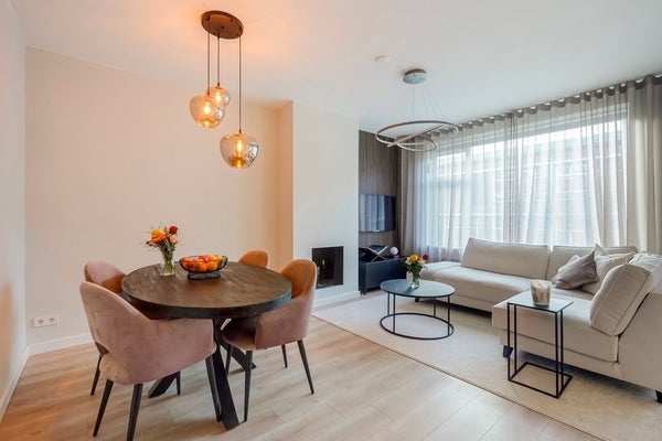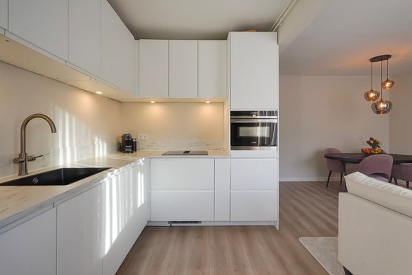 De moderne woon-/eetkamer is gelegen aan de voorzijde van de woning en vormt het hart van het appartement. Dankzij de grote raampartijen geniet u hier van veel natuurlijk licht. De sfeervolle open haard zorgt voor extra warmte en ambiance. De open keuken sluit naadloos aan op de living en is modern uitgevoerd met onder andere een 4-pits inductiekookplaat met geïntegreerd afzuigsysteem, een combi-oven, koel-/vriescombinatie en een praktische heetwaterkraan – ideaal voor wie van koken houdt.