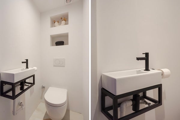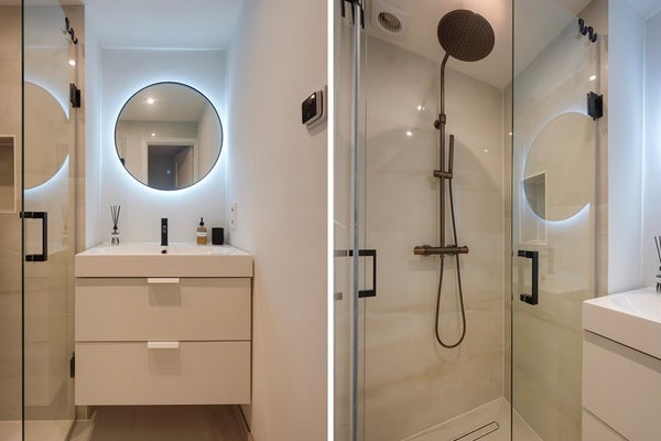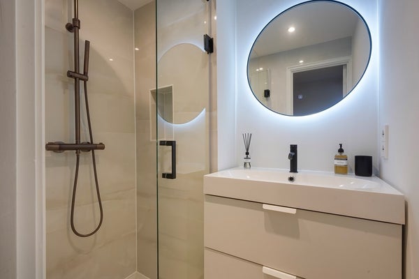 De moderne badkamer is stijlvol afgewerkt en uitgerust met een ruime douche, vloerverwarming en een wastafelmeubel. Het naastgelegen toilet is keurig onderhouden en voorzien van een fontein.