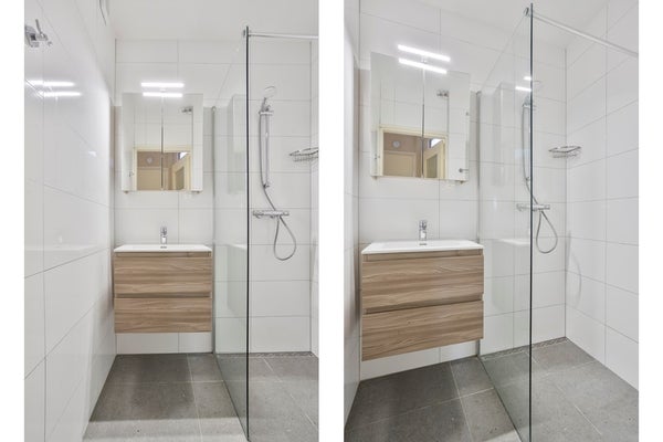 Badkamer met inloopdouche, wastafel(meubel), design radiator