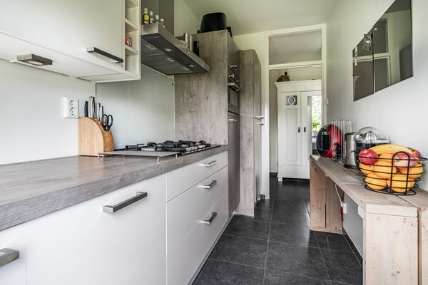De keuken is modern uitgevoerd en van alle gemakken voorzien: een 5-pits gasfornuis, oven met magnetronfunctie, vaatwasser en aansluitingen voor wasmachine en droger. Praktisch én stijlvol.