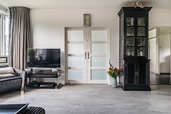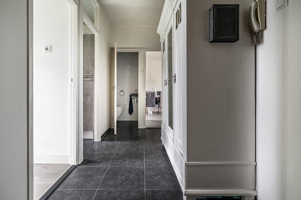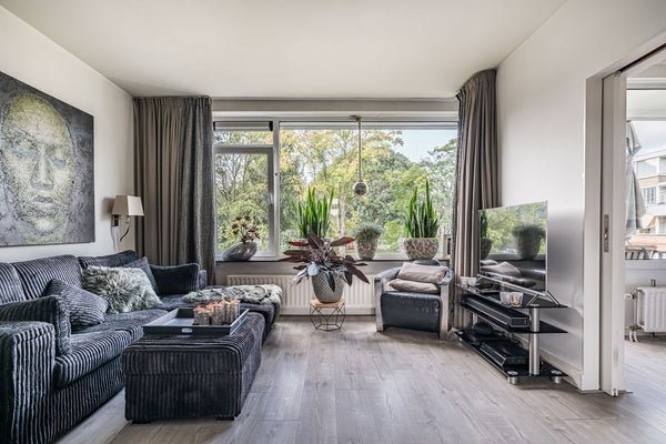 De royale hal geeft toegang tot de woonkamer, keuken, toilet en eerste slaapkamer. De woonkamer is ruim en licht en vormt het hart van de woning. Vanuit hier bereik je twee andere slaapkamers: één aan de achterzijde en één aan de voorzijde met toegang tot het zonnige balkon aan de voorkant, met prachtig vrij uitzicht over het plantsoen. Een heerlijke plek om te genieten van rust en groen.
