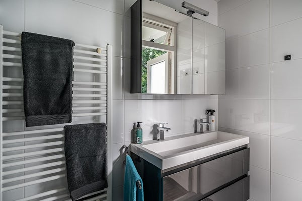 De moderne badkamer is voorzien van vloerverwarming, inloopdouche, dubbele wastafelmeubel, handdoekradiator en strak weggewerkte leidingen. Het separate, vrijhangende toilet is uitgerust met fontein en ventilatiesysteem.