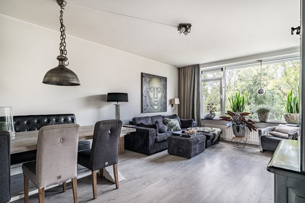 Lichte woonkamer met balkon en groen uitzicht
