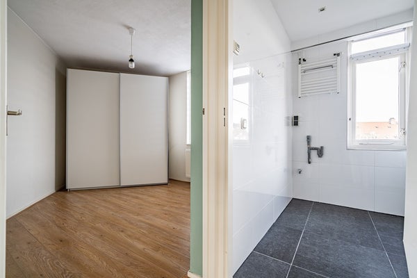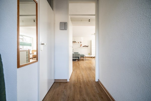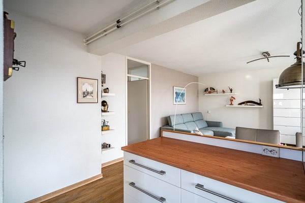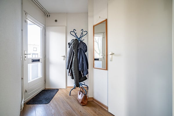 Via slechts twee trappen bereikt u de voordeur van het appartement op de eerste verdieping. Bij binnenkomst valt direct de nette afwerking op. De entree biedt toegang tot een praktische garderobekast en leidt u verder naar de woonkamer.