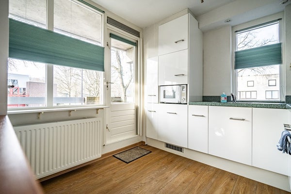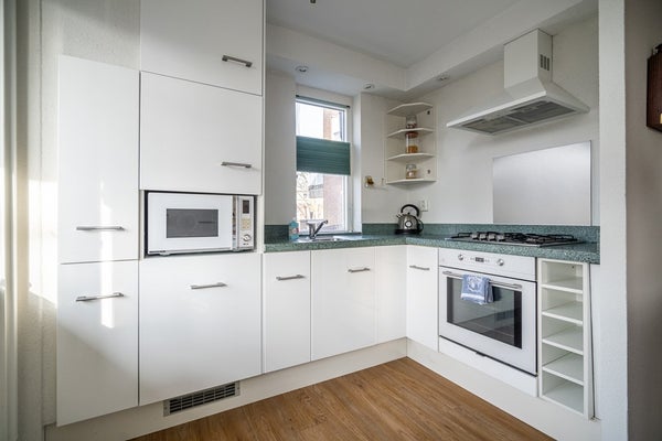 De open keuken sluit naadloos aan op de woonkamer en is compleet uitgevoerd met een vierpits gasfornuis, afzuigkap, vaatwasser, oven en een koel-vriescombinatie. Het natuurstenen werkblad geeft de keuken een luxe uitstraling. Vanuit de keuken heeft u toegang tot het balkon op het zuidwesten, een heerlijke plek om na een lange dag te genieten van de middag- en avondzon.