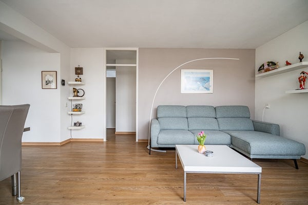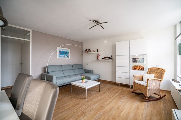 De woonkamer is licht en sfeervol dankzij de vele ramen die zorgen voor een prettige daglichtinval. De laminaatvloer en de verzorgde afwerking geven het geheel een warme en comfortabele uitstraling. Hier voelt u zich direct thuis.