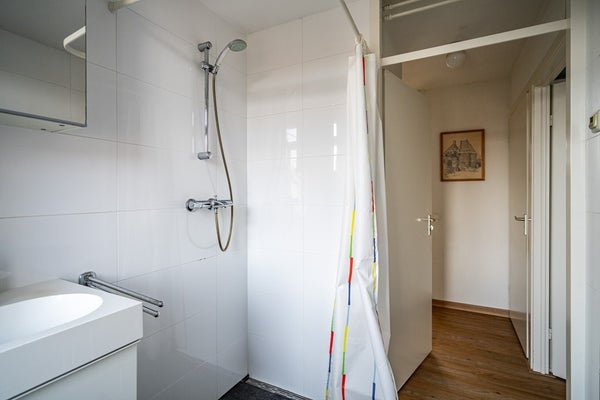 De badkamer is modern en comfortabel ingericht met een inloopdouche, wastafelmeubel, vloerverwarming en een aansluiting voor de wasmachine — een fijne, complete ruimte waar aan alles is gedacht.