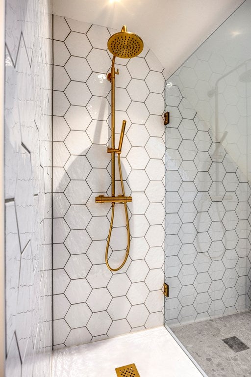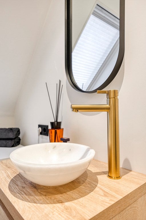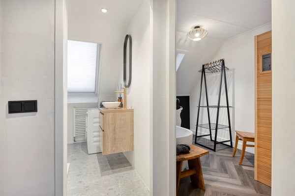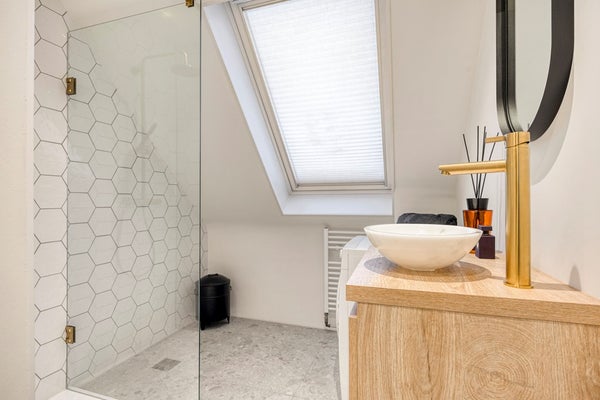 De badkamer is eveneens fraai afgewerkt met modern tegelwerk en sanitair. Het beschikt over een ruime inloopdouche, dakvenster, wastafelmeubel met wasbak en aansluitingen voor de wasmachine.