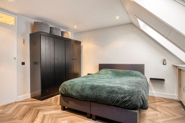 De grote slaapkamer beschikt over twee grote dakvensters en bergruimte onder de schuinte van de kap.