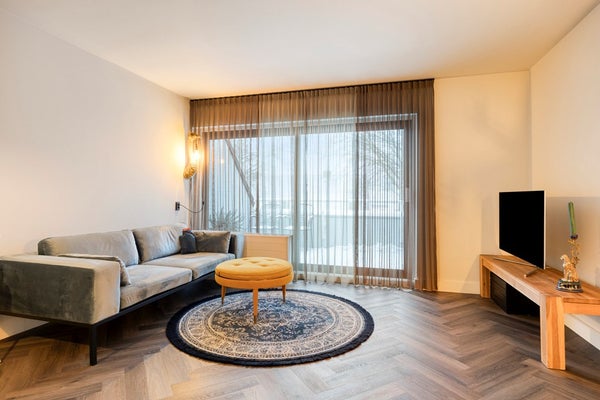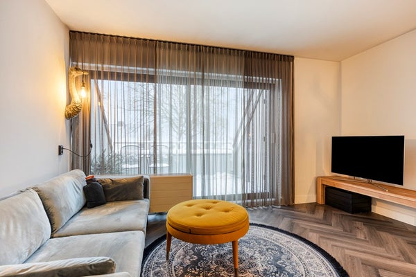 De woonkamer beschikt over een fraaie PVC-vloer gelegd in visgraat motief. Aan de achterzijde is een een grote schuifpui naar het balkon.