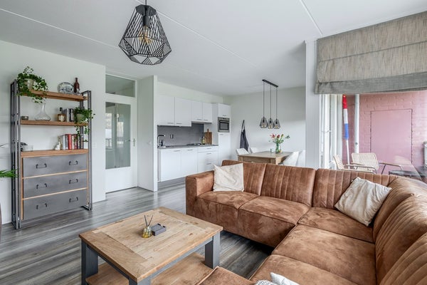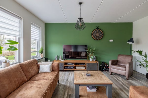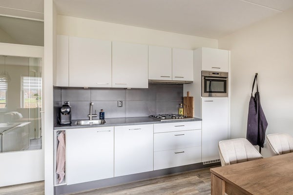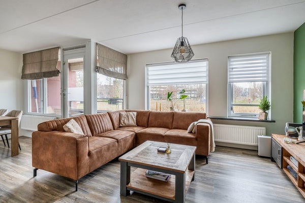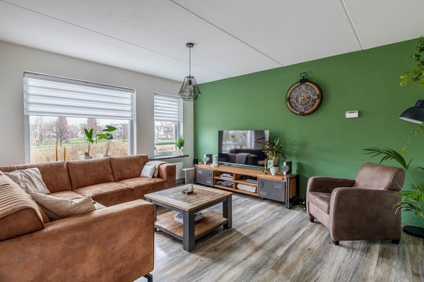 Wooncomfort voert hier de boventoon. De woonkamer strekt zich uit over de hele breedte aan de achterzijde en is dankzij de grote ramen opvallend licht. Schuif de dag binnen vanaf je luie stoel en kijk uit over het rustige groen: geen pottenkijkers, gewoon privacy. Het mooie laminaat loopt vloeiend door richting de eetkeuken, waardoor de ruimte logisch én groter aanvoelt.