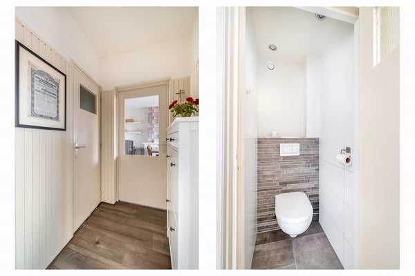 Tenslotte bevindt zich in de gang ook nog de toiletruimte. Deze is in 2024 vernieuwd, gedeeltelijk betegeld en voorzien van vrij hangend closet.