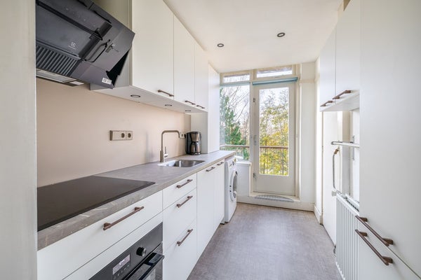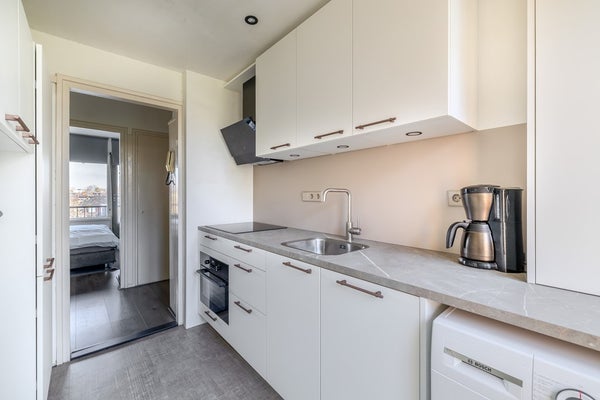 De keuken is onlangs vernieuwd en is uitgevoerd in lichte kleuren. De keuken is mooi compleet met een inductiekookplaat en afzuigscherm, combi oven-magnetron en onder het werkblad staat een moderne wasmachine met geïntegreerde droger, welke ook achterblijft in de woning. Aan de andere zijde is een inbouw koel-/vriescombi en extra kastruimte. In de keuken bevindt zich ook de CV-combiketel. Deze compacte Nefit HR ketel is netjes weggewerkt achter een paneel en is daarmee geheel uit het zicht. Vanuit de keuken is er toegang tot een klein balkon en ook de badkamer is vanuit de keuken bereikbaar.
