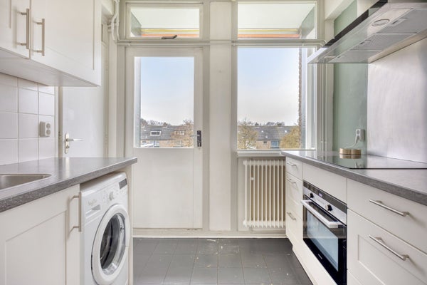 Via het gesloten portiek met bellentableau met intercom bereikt u de woning op de derde woonlaag. De entree geeft toegang tot twee van de drie slaapkamers en de woonkamer. Een tussenportaal leidt naar de derde slaapkamer en het separaat (vrijhangend) toilet met fonteintje. De ruime woonkamer is doorgebroken en heeft veel lichtinval door de grote raampartij met vrij uitzicht en geeft toegang tot het balkon aan de voorzijde. Een grote slaapkamer en een tweede slaapkamer zijn aan de achterzijde van de woning gelegen met tevens een vrij uitzicht. De derde slaapkamer bevindt zich aan de voorzijde van de woning. De keuken is voorzien van diverse inbouwapparatuur en geeft toegang tot de badkamer en het balkon aan de achterzijde, welke is gelegen op het Oosten (ochtend en middagzon) en uitkijkt op de goed onderhouden gezamenlijke binnentuin. De badkamer heeft een douche, wastafel, spiegelkast, opstelplaats voor de Cv-ketel en is tevens te bereiken vanuit de hoofdslaapkamer.