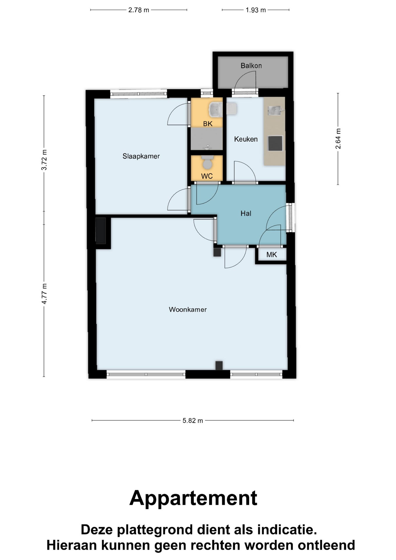 - De galerijflat heeft een woonoppervlakte van 52 m² en beschikt over 2 kamers, waarvan 1 slaapkamer;