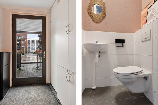 Hoofdentree met keurige centrale hal met beltableaus en postvakken, lift- en trapopgang, entree naar de parkeergarage en gezamenlijke fietsenstalling en brommerberging. Je bereikt de woning via de lift in de centrale hal of de naastgelegen trap. De woning is tevens bereikbaar via de binnenpleinen van het appartementencomplex.