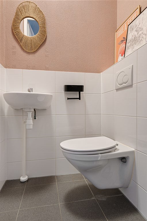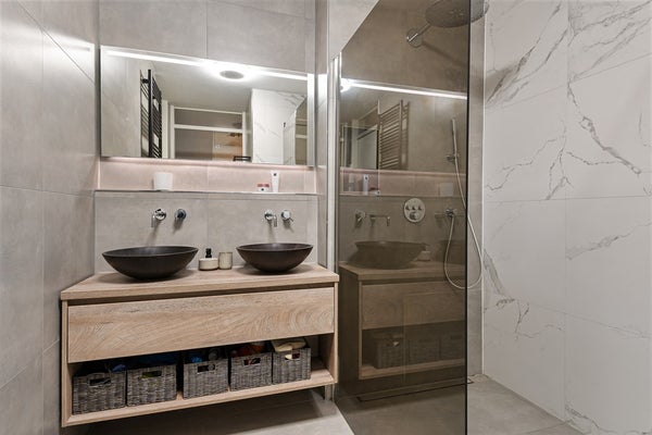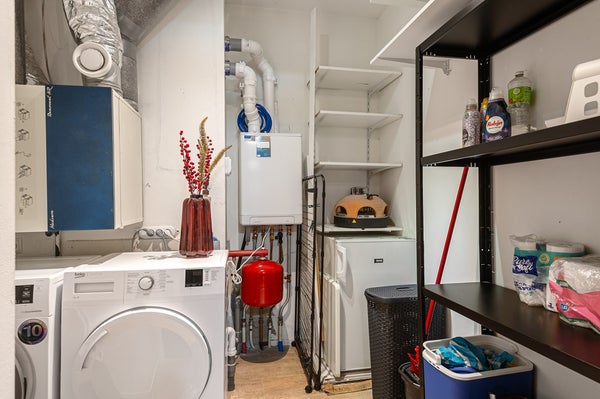 The entrance is reached via the front garden, situated on one of the raised courtyards. Here you'll find the meter cupboard and built-in wardrobe. From here, you enter the spacious living room and luxurious open-plan kitchen with various built-in appliances. From the bright living room with its tall windows, French doors open onto the spacious, sunny front garden (W). The tiled front garden is enclosed by a beautiful fence, perfect for relaxing. The modern, straight-lined kitchen with light-colored fronts features a dark composite countertop. The kitchen has a sink island, a breakfast bar, and is equipped with all modern appliances. The floor is PVC, and the walls and ceilings are sleekly finished. A door in the living room leads into the hallway, which provides access to both very spacious bedrooms, a large laundry/storage room with a heat recovery unit and a recently replaced central heating boiler, a neatly tiled separate toilet, and the bathroom with a walk-in shower and a double vanity with vanity and mirror. The bathroom was completely renovated in 2020. Both bedrooms are located at the rear of the house and have French doors leading to a French balcony. The master bedroom has a door to the bathroom, while the second bedroom has access to the bathroom through the hallway. This part of the house is also immaculately finished, making it ready for immediate move-in.