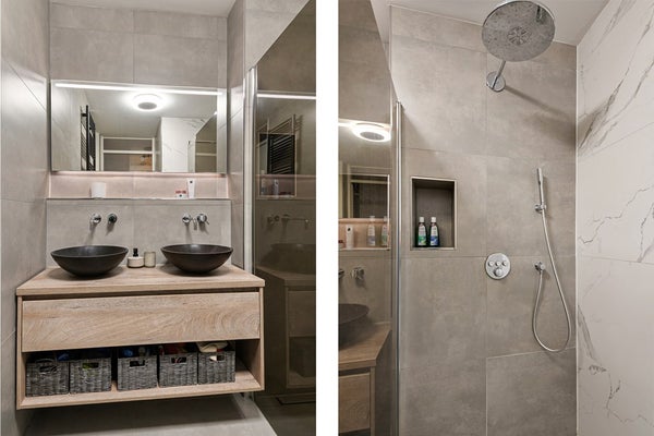 Main entrance with a neat central hall featuring doorbells and mailboxes, elevator and stairs, and access to the parking garage and shared bicycle and moped storage. You reach the apartment via the elevator in the central hall or the adjacent stairs. The apartment is also accessible via the courtyards of the apartment complex.