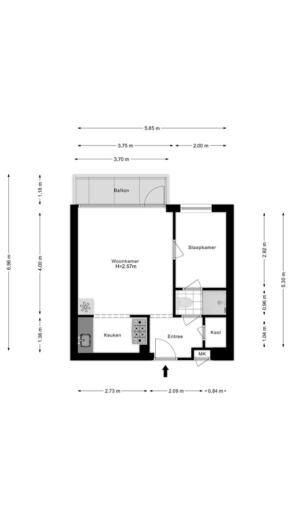 - De galerijflat heeft een woonoppervlakte van 33 m² en beschikt over 2 kamers, waarvan 1 slaapkamer;