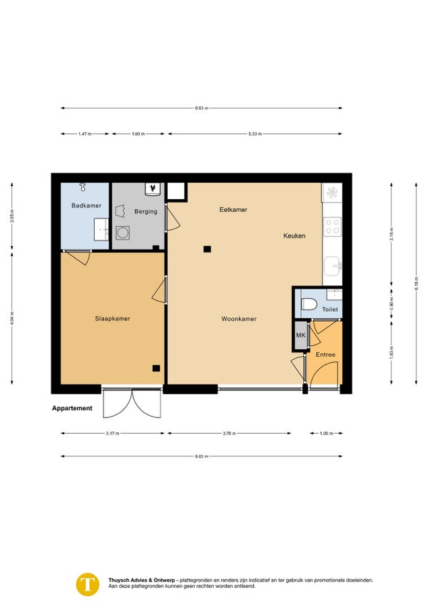 • De benedenwoning heeft een woonoppervlakte van 53 m² en beschikt over 2 kamers, waarvan 1 slaapkamer;