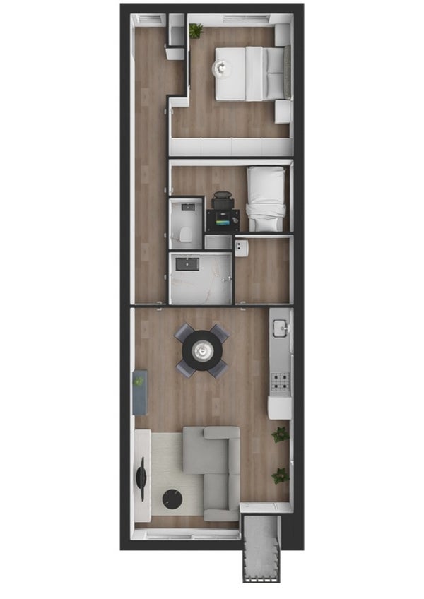 - De galerijflat heeft een woonoppervlakte van 65 m² en beschikt over 3 kamers, waarvan 2 slaapkamers;