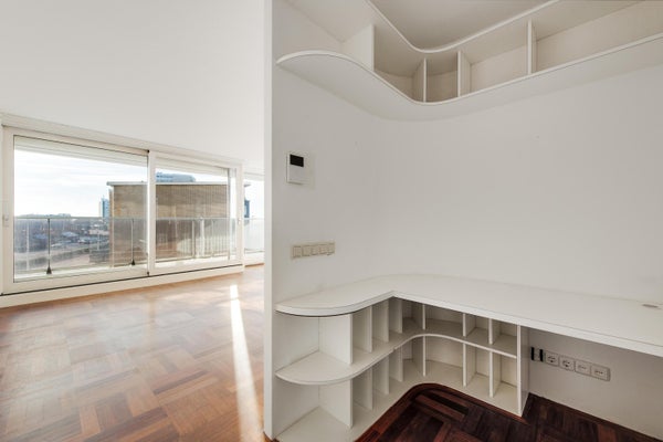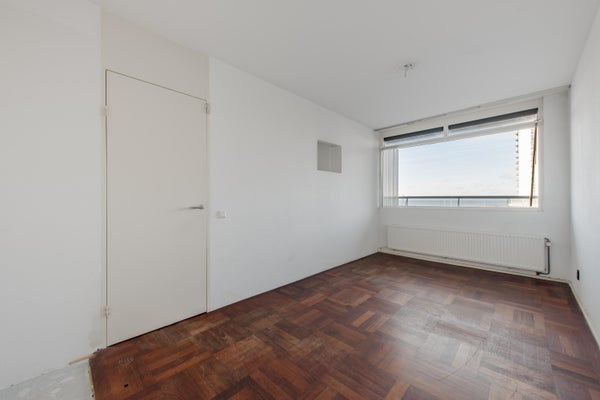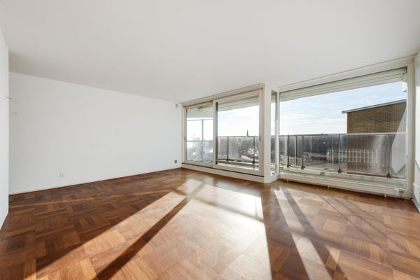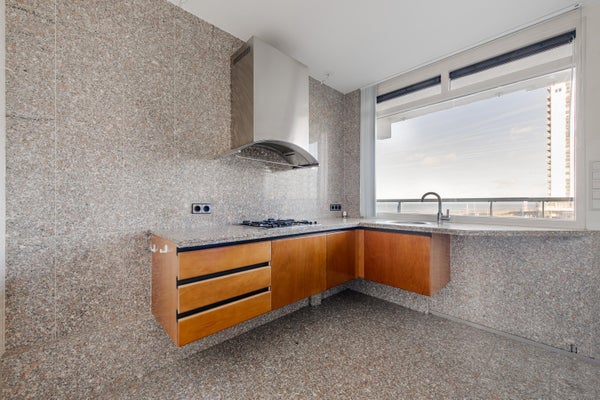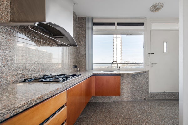 Een royale woonkamer met grote raampartij, dus heerlijk licht en natuurlijk een groot balkon (maar liefst 6.19m breed) op het zuid-westen, waar je de hele dag van de zon en het fraaie uitzicht kunt genieten. Het appartement is van oorsprong een 3 kamer-appartement. In één van de slaapkamers is momenteel de keuken geplaatst, zodat de woonkamer nog ruimer is geworden. Verder is er op dit moment 1 grote slaapkamer. Indien gewenst kan de keuken ook weer in de woonkamer worden geplaatst, zodat je weer 2 slaapkamers hebt. Op de parterre is er een eigen berging.