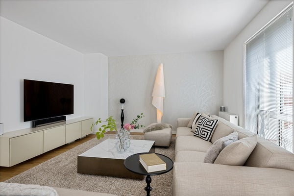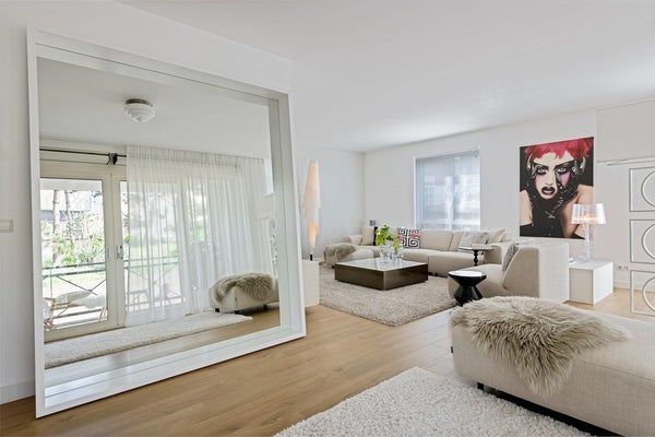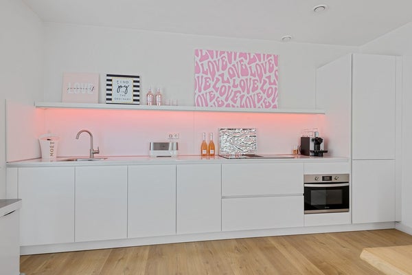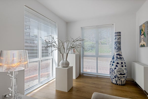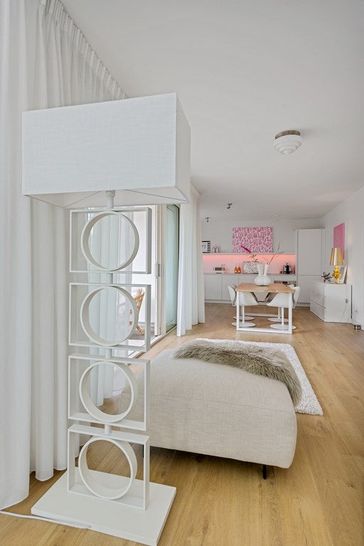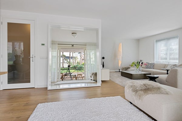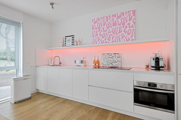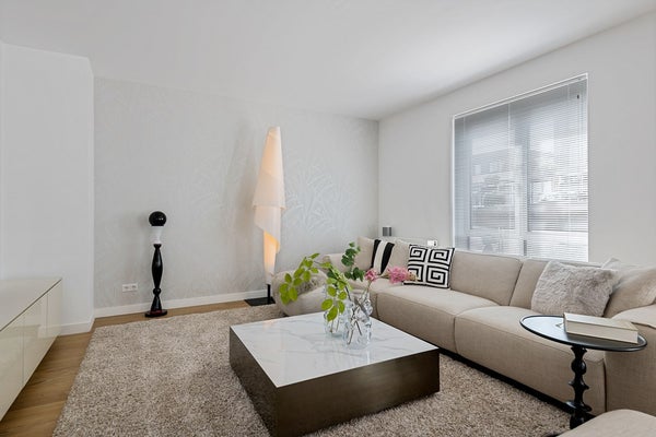 De lichte woonkamer zorgt voor een aangename leefruimte waar je kunt ontspannen en genieten van natuurlijk licht, door de openslaande deuren loop je zo het ruime balkon op.