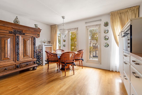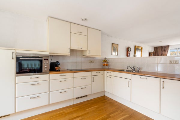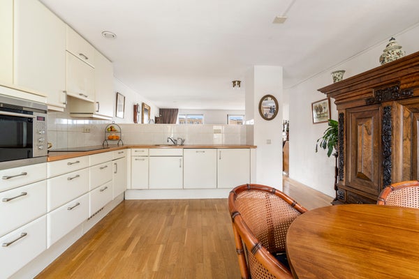 Aan de voorzijde ligt de royale woonkeuken met eetgedeelte, uitgevoerd in een hoekopstelling en voorzien van diverse inbouwapparatuur zoals een vaatwasser, combi-oven, inductie kookplaat en koel-/vriescombinatie.