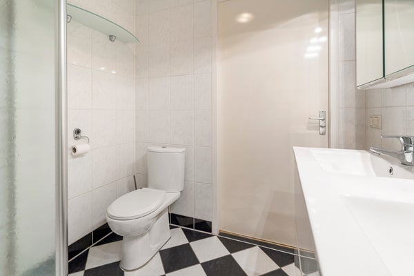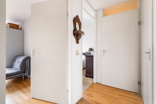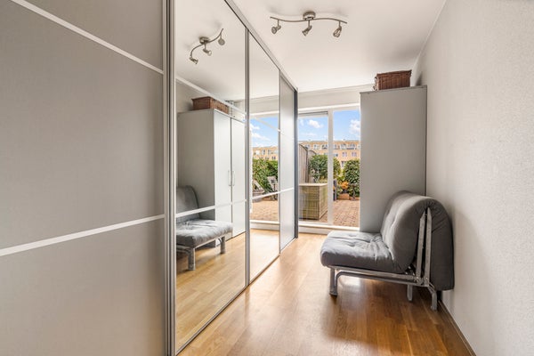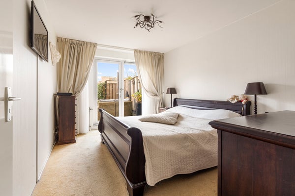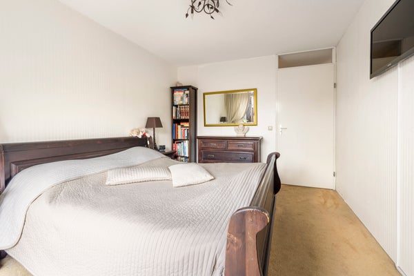 Aan de achterzijde bevinden zich twee comfortabele slaapkamers, beide met openslaande deuren naar de zonnige tuin op het westen. De hoofdslaapkamer (ruim 13 m²) biedt volop ruimte voor een groot bed en kastenwand. De tweede kamer is ideaal als logeer-, werk- of kastenkamer. Verder vind je op deze verdieping een nette badkamer met dubbele wastafel, douche en toilet, een praktische bergkast en een separaat toilet met fontein.