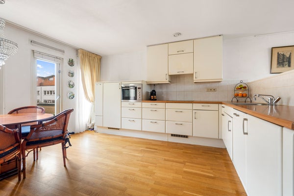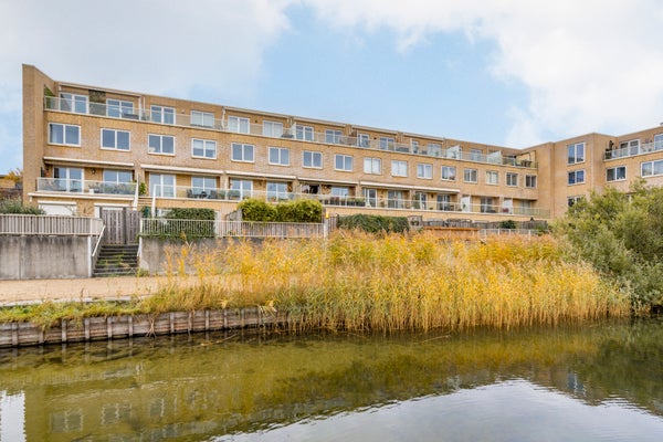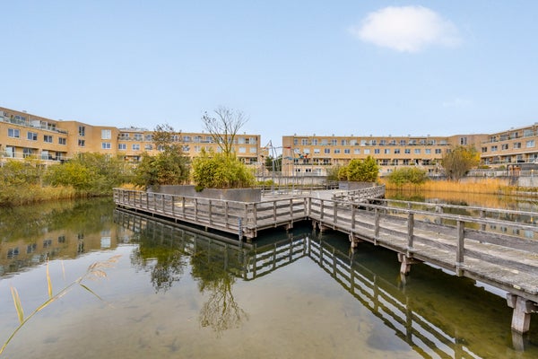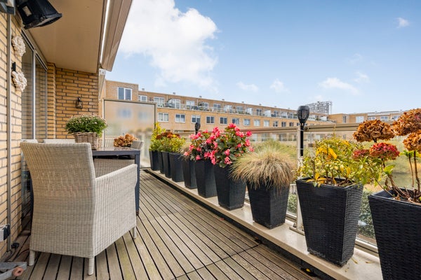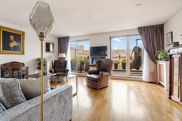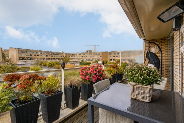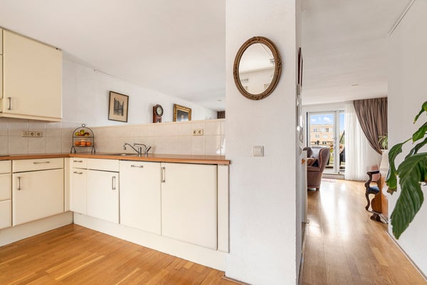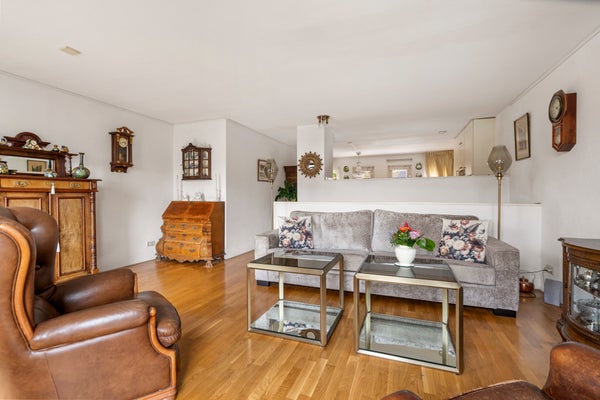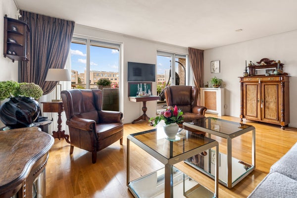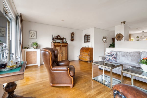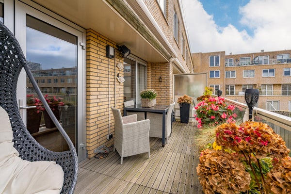 Hier bevindt zich de lichte en gezellige woonkamer met grote raampartijen en toegang tot het heerlijke balkon op het westen, met uitzicht op de groene binnentuin met vijver. Dankzij de gunstige ligging geniet je hier van de middag- en avondzon, terwijl het elektrische zonnescherm zorgt voor verkoeling op warme dagen.