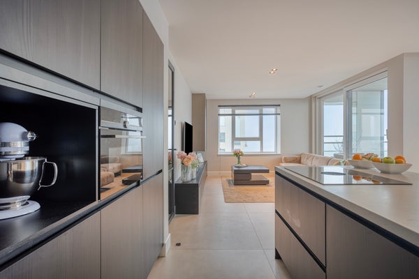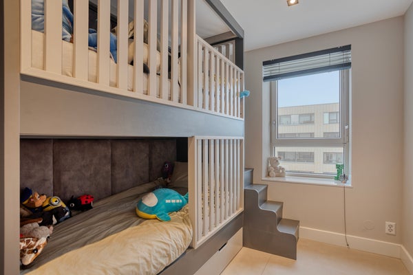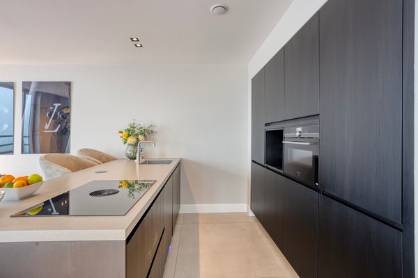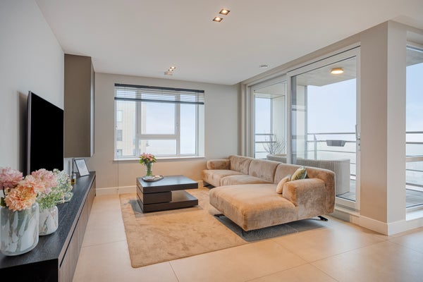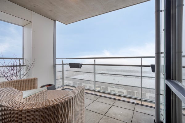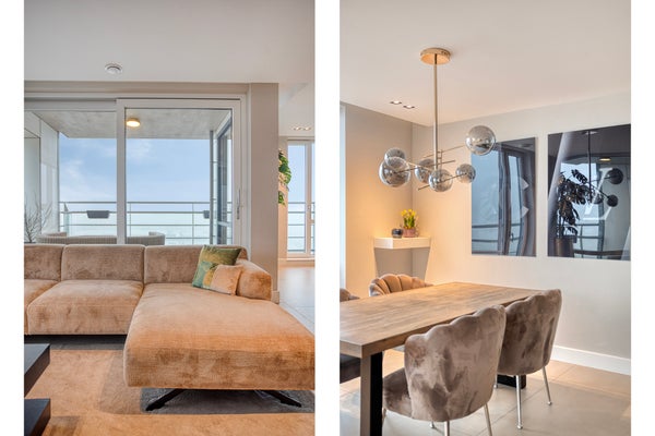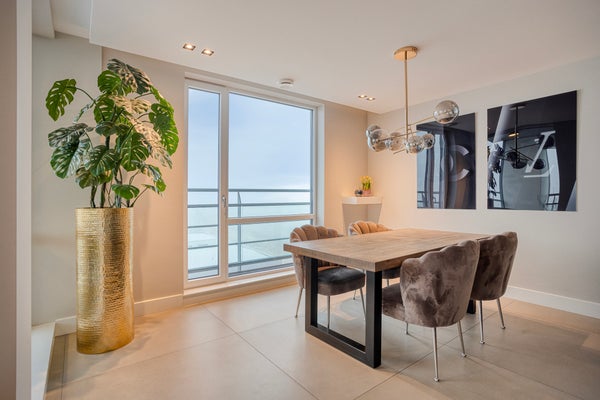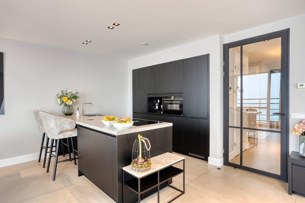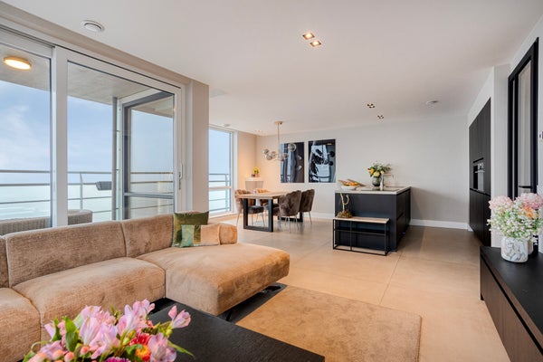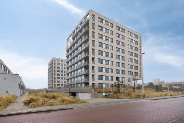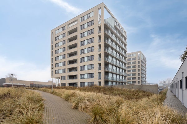 This modern three-room corner apartment is located on the 7th floor of the popular “Santfort” apartment complex, adjacent to the dunes and built in 2021. The high-quality finishes reflect contemporary standards of luxury and sustainability. The spacious, light-filled living room, the luxurious kitchen with an island and ceramic countertop, the plastered ceilings with dimmable recessed spotlights, and the balcony together form the heart of the home. Additionally, it features two comfortable bedrooms with custom-made wardrobes, a luxurious bathroom with a freestanding bathtub, a separate toilet, and a technical room with connections for a washing machine and dryer. In every room, you’ll enjoy comfortable underfloor heating that can be set independently per room. Extra comforts include your own storage room, a covered parking space, and a communal bicycle storage area in the basement.