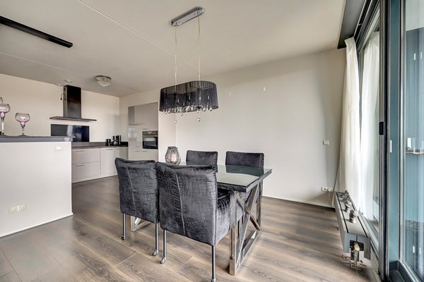 De schuifpui zorgt voor een mooie verbinding met het balkon. Op dit balkon is een speciale glazen wand geplaatst die eventueel weg te schuiven is. Op deze manier kan je ook als het weer iets minder is toch lekker buiten zitten.