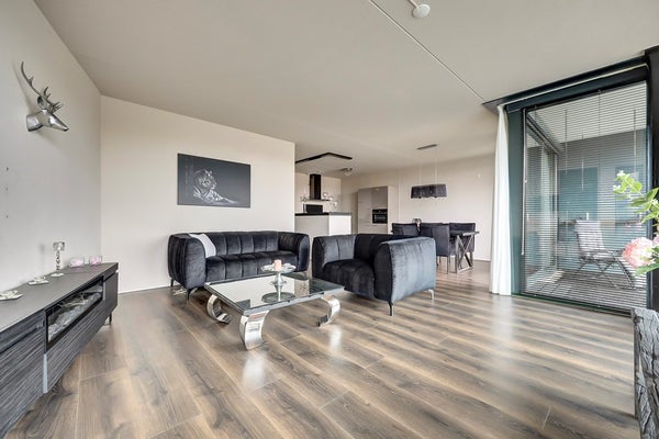 Langs de 2 slaapkamers, het toilet, de badkamer en de wasruimte kom je binnen in de living. Eenmaal in de woonkamer wordt je blik meteen naar buiten getrokken. Dit is echt genieten. Er is altijd wel wat reuring voor het complex dus je verveelt je hier nooit. De ramen reiken tot aan de vloer dus ook als je zit heb je een onbelemmerd uitzicht naar buiten.