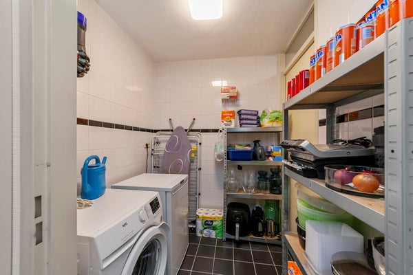 Hal met modern hangend toilet en fontein, meterkast, strakke glazen tegelwand en inpandige berging ( welke volledig is betegeld ) met opstelplaats C.V., wasmachine en droger aansluiting.