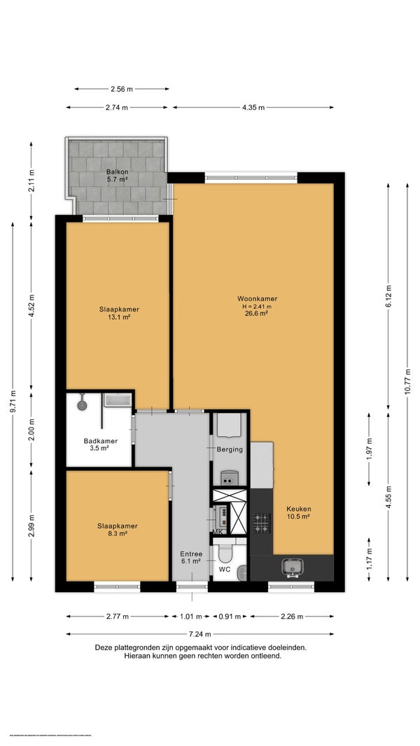 - De galerijflat heeft een woonoppervlakte van 74 m² en beschikt over 3 kamers, waarvan 2 slaapkamers;