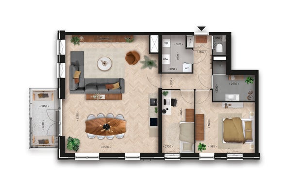 - De portiekflat heeft een woonoppervlakte van 104 m² en beschikt over 3 kamers, waarvan 2 slaapkamers;