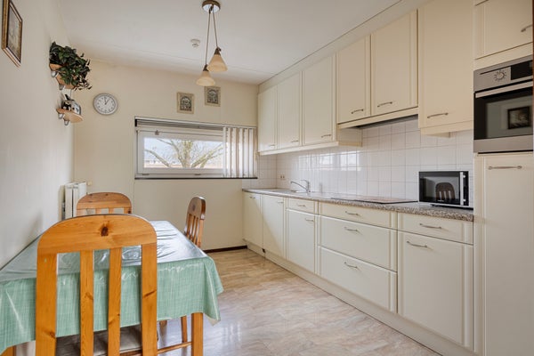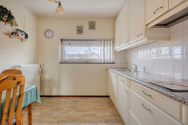 De halfopen, degelijke inbouwwoonkeuken heeft een speels liggend raam, is voorzien van diverse onder-/ en bovenkasten, een afzuigkap, een inductiekookplaat, een koelkast, een combi-oven en een vaatwasser.