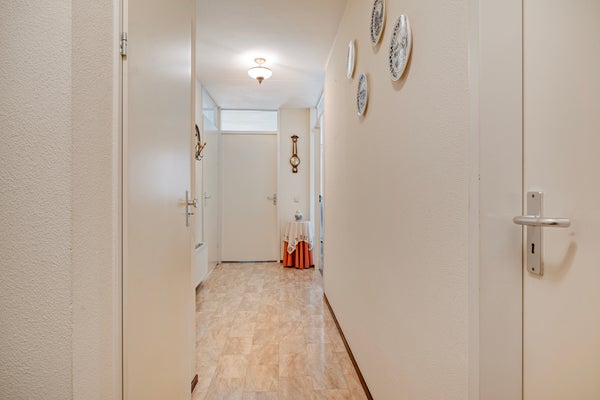 De ruime hal met een moderne meterkast is de spil van het appartement en geeft een goede indruk van de ruimte en afwerking die u mag verwachten. Deze hal biedt toegang tot de 2 slaapkamers, de badkamer, de technische ruimte annex bijkeuken, de separate toiletruimte en de woonkamer.