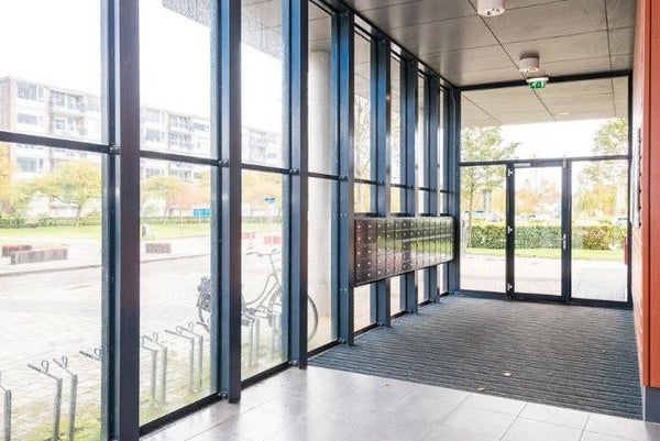 Via de afgesloten entree met bellentableau en brievenbussen kom je in de grote centrale hal met de twee liften, het overdekte trappenhuis en de gezamenlijke fietsenbergingen. De toegang tot het appartementencomplex is ook toegankelijk voor minder valide personen.