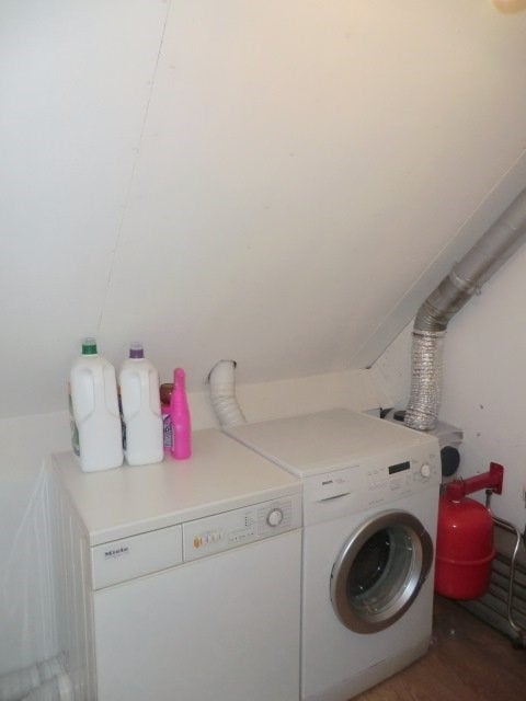 overloop, wasruimte met wasmachine en -droger, ruime slaapkamer (ca. 3,80 x 3,16 m) met veel bergruimte achter knieschotten.