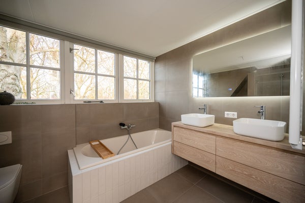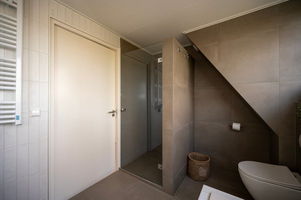 Via de trap bereikt u de bovenverdieping, waar zich twee ruime slaapkamers bevinden. De moderne badkamer is luxe uitgevoerd en voorzien van: een ligbad, dubbele wastafel met meubel, handdoekradiator, toilet en een inloopdouche. Op de overloop bevinden zich tevens de aansluitingen voor de wasmachine en droger.