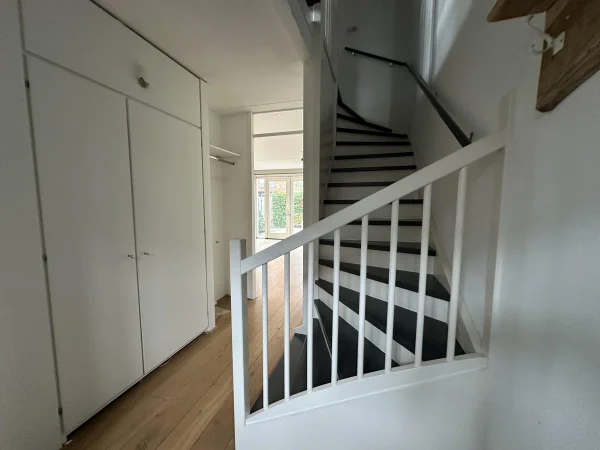De indeling omvat een entree met hal en toilet, een lichte woonkamer met toegang tot de tuin aan beide zijden, en een hoekkeuken met oven/magnetron, koel/vries combinatie, vaatwasser en een 5-pitsgasstel. Boven zijn er drie slaapkamers en een luxe badkamer met ligbad en douchecabine. Op de bovenste verdieping is een enorme ruimte die als slaapkamer of werkkamer kan dienen. De nette voortuin en grote zijtuin op het zuiden zijn voorzien van verlichting en stopcontacten.