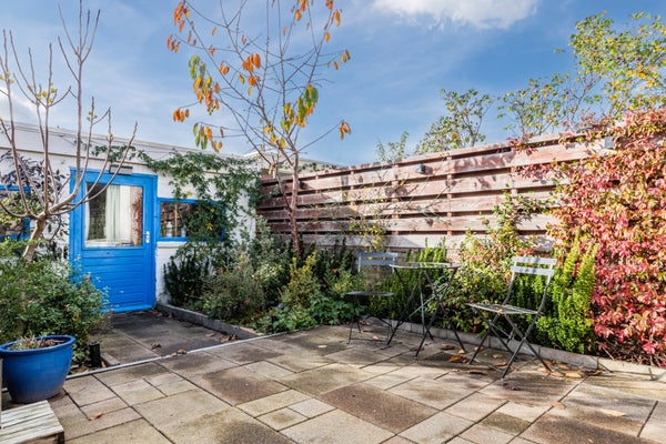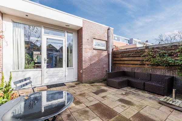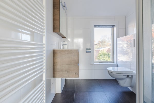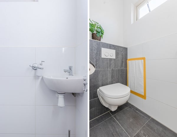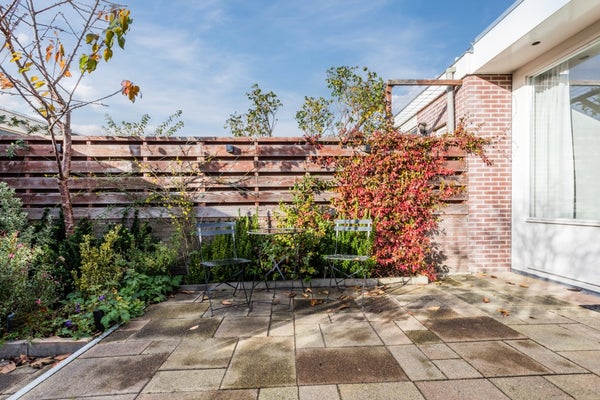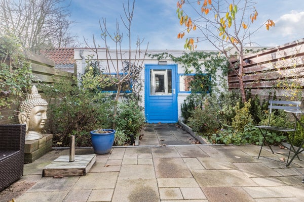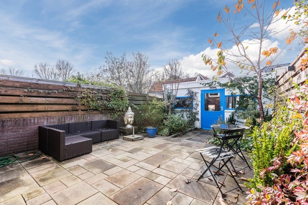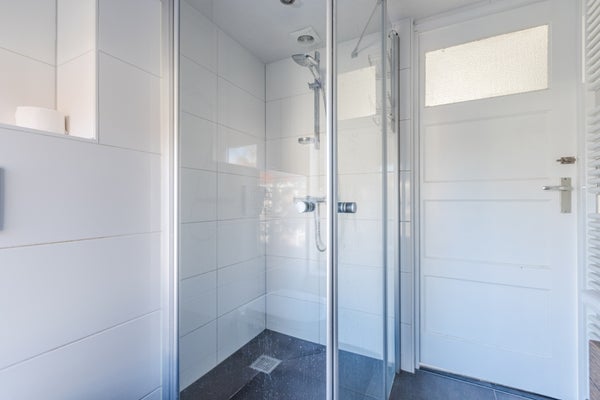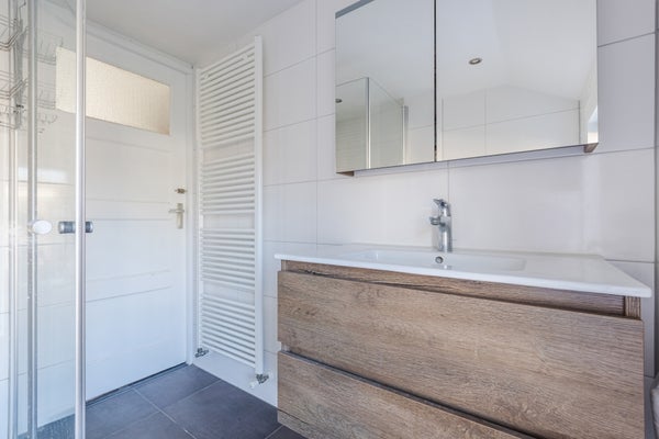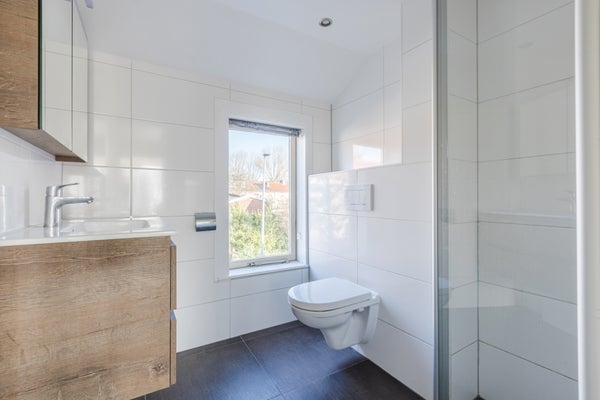De luxe badkamer is fraai afgewerkt met een ruime douche, een wastafel en moderne tegels. Daarnaast beschikt de woning over een separate toiletruimte en een praktische berging. Achter de woning ligt een zonnige tuin met een schuur — ideaal voor het opbergen van fietsen of tuinspullen, en een fijne plek om van het buitenleven te genieten.