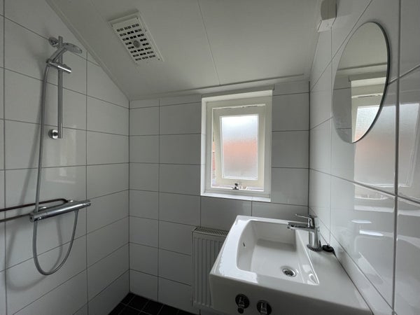 Overloop, drie slaapkamers van ca. 10 m², 9 m² en 4 m² groot. Badkamer met douche en wastafel.