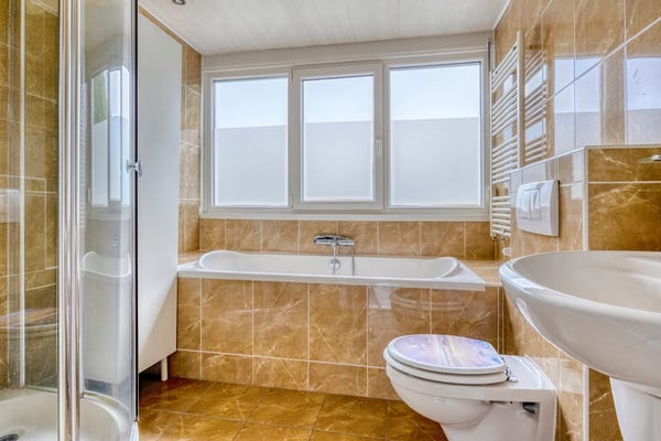 Eerste verdieping; overloop, 3 ruime slaapkamers, badkamer. De badkamer is voorzien van douche, bad, wastafel, toilet en designradiator.