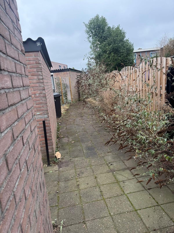 De ruime tuin heeft een achterom en een schuurtje, waar je genoeg spullen kan opbergen.