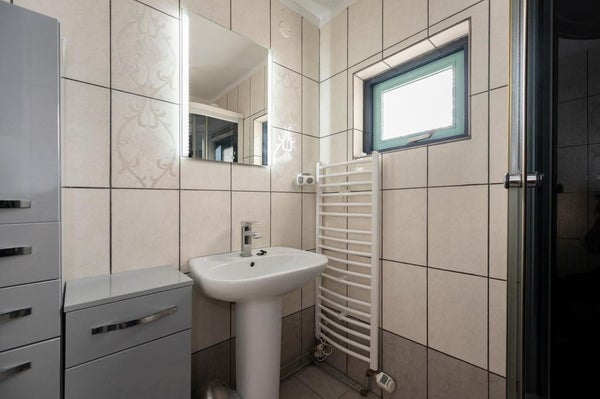 Overloop met toegang tot drie slaapkamers en de badkamer. De volledig betegelde badkamer is voorzien van een douchecabine, wastafel, tweede toilet en badmeubel. Alle slaapkamers zijn afgewerkt met een laminaatvloer.