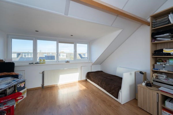 Ruime zolderkamer met dakkapel en laminaatvloer, geschikt als extra slaapkamer, werk- of hobbyruimte.